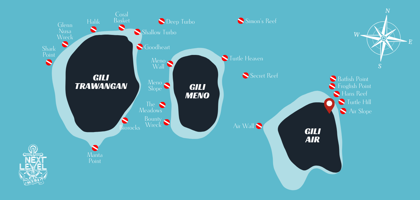 There are about 20 dive sites around the islands of Gili Air, Meno, and Trawangan. With a variety of topography such as slopes, walls, ridges, and canyons as well as an enormous amount of diverse marine life, including black and white tip reef sharks, lots of turtles (green and hawksbill), lionfish, scorpionfish, cuttlefish and octopus, moray eels, sea snakes, different types of rays (blue spotted, Kuhls, eagle and even manta!) crazy critters like peacock mantis shrimp, pygmy seahorse, pipefish, Indian walkman as well as frogfish.